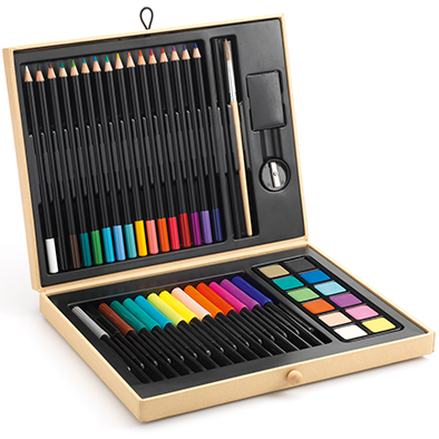 Una hermosa valija para llevar a todas partes con un conjunto compacto de pinturas, bolígrafos y lápices. Incluye 16 lápices para colorear, 14 rotuladores finos, 12 pinturas de acuarela, 1 pincel, 1 lápiz, 1 sacapuntas y un borrador.