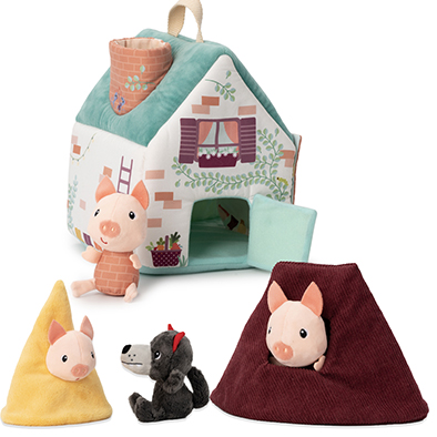Este juguete de tela, inspirado en el cuento del lobo y los tres cerditos, incluye 4 personajes, 2 casitas que representan las casas de paja y madera, y una tercera casa que representa la casa de ladrillos. La casa de ladrillos tiene una chimenea por donde el lobo puede deslizarse, así como una pared que se abre. Estimulando la imaginación, este juguete fomenta el juego creativo y desarrolla habilidades motoras finas. Fabricada en material suave y resistente, de excelente calidad y diseño.