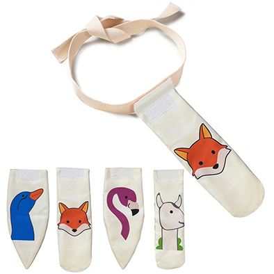 Set de cuatro cinturones de algodón, con colas de género, medidas aproximadas cinturón 100 x 2 centímetros, colas 24 x 5 centímetros. Con figuras de animales de Chile.