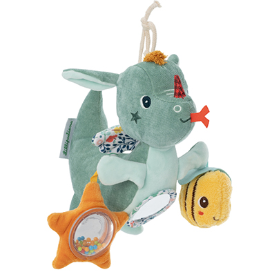 Hermoso colgante para acompañar a los más pequeños desde los primeros meses. Joe el dragón y su amigo el abejorro vuelan alegremente por encima del bebé. Incluye sonidos, texturas y reflejos para intrigar y atraer a los más pequeños. Se convierte fácilmente en un peluche. Fabricado en material suave y resistente, de excelente calidad y diseño.