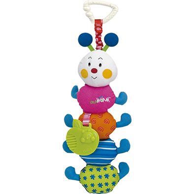 Colgante para acompañar al bebe. Cuerpo blando y con diferentes texturas que suenan. Viene con un mordedor y percha en forma de flor para engancharlo en cualquier cuna o coche.