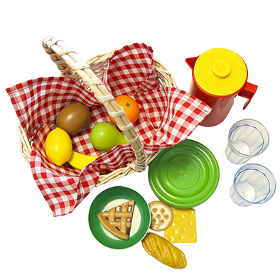 Set de comida compuesto por: 4 vasos transparentes de 7,5cm de ato c/u, 4 platos de té de diámetro 11 cm c/u, 1 jarro de te de 12,5 cm, 1 plato cereal, 4 piezas en plástico resistente de panadería variado (panes, galleta, queso y pastel), 5 frutas de madera, 1 pañuelo y 1 canasto de mimbre con asa.