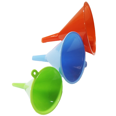 Set de 3 embudos de colores y de tres tamaños diferentes. Embudo chico 10 x 7,5 cm, mediano 12,5 x 10 cm, grande 16 x 12 cm.