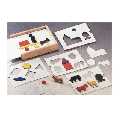 Encaje de animales de madera en plantillas plásticas. 5 diferentes plantillas plásticas y 15 animales de madera de colores. La planilla se monta en la caja para un adecuado encaje. Muchas maderas de encajar y descubrir.
