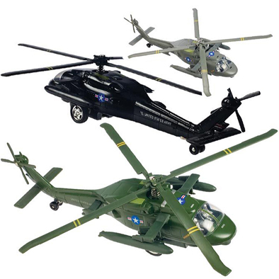 Helicóptero de metal con partes plásticas. Con tracción. Replica modelo real. De excelente calidad y diseño. 3 colores surtidos. Precio por unidad.