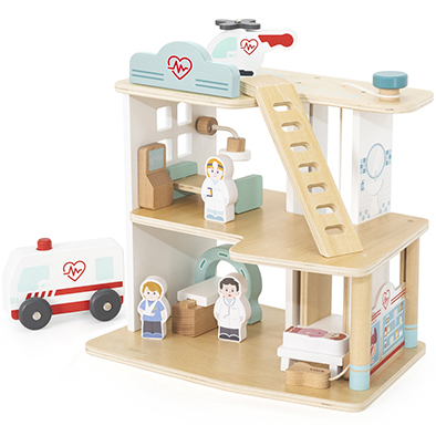 Este hospital Viga de tres pisos es un juguete fantástico para pequeños médicos y enfermeros. Su estructura de madera, altamente detallada y equipada, garantiza muchas horas de juego creativo mientras salvan vidas y atienden a pacientes. Gracias a la gran cantidad de elementos, los niños podrán crear escenarios médicos realistas, desarrollando la empatía y las habilidades sociales. Recomendado para niños a partir de 3 años. El set incluye: un edificio hospitalario de madera de tres pisos, ambulancia, helicóptero de rescate, figuras de un médico, una enfermera y dos pacientes, equipo médico: tomografía computarizada, ecógrafo, monitor cardíaco, dos camas de hospital, lámpara de quirófano. Fabricado en material suave y resistente con colores pastel.