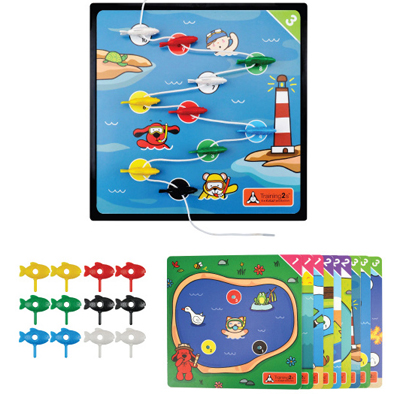 Este divertido juego está diseñado para reforzar la motricidad fina y la coordinación ojo-mano. Desarrolla el concepto de color y la discriminación visual. El entrenamiento de los músculos de los dedos es esencial para que los niños y niñas desarrollen la escritura. Incluye un tablero, 12 clavijas de colores con forma de pez, 9 tarjetas de juego de diferentes niveles y 2 cordones. Los niños y niñas deben colocar una tarjeta de juego en el tablero, luego insertar las clavijas en los agujeros del mismo color. Finalmente entrelazar las clavijas una a una según las secuencias indicadas. Varios niveles de dificultad. Incluye: 1 tablero, 12 clavijas con forma de pez, 9 tarjetas de juego, 2 cordones. Fabricado en material suave y resistente.