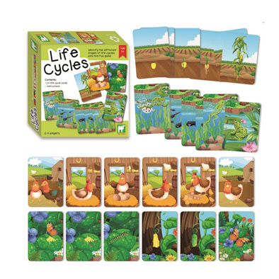 Juego de 24 tarjetas de fotos que desarrolla destrezas en términos posicionales y lingüísticos. Una gran manera de introducir a los niños al concepto de los ciclos de la vida del insecto, de el animal y de la planta. Los niños se divertirán poniendo las cartas en secuencia y describiendo lo que sucede. Incluye guía al profesor en 11 idiomas. De 2 a 4 jugadores. Cada tarjeta 21 x 15 cm c/u.
