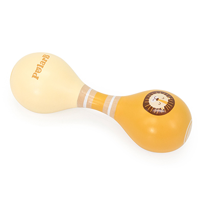 Divertida maraca doble de madera con un suave sonido para pasar horas de diversión. Fabricado en madera con colores suaves y diseño de simpáticos personajes que le encantarán a los más pequeños. De fácil agarre para manos pequeñas.