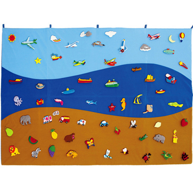 Panel de tela de 3 colores distintos: café́ (representando la tierra), azul (representando el mar) y celeste (representando el aire). Incluye 20 figuras de medios de transporte y 36 figuras de animales, todas con un velcro que permite adherirlo en el panel de tela. Favorece la creatividad y ampliación del lenguaje, junto con el juego colaborativo. Viene con bolsa de genero para guardar.