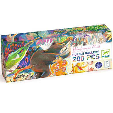 Hermoso puzle artístico de 200 piezas de Djeco con ilustraciones de una colorida jungla llena de maravillosos animales, pintado por el artista Soyung Lee. Puzle armado 97 x 33 cm. Fabricado en papel y cartón con certificación FSC®.