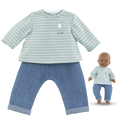 Hermoso conjunto de polera a rayas y pantalón estilo blue jeans para que las muñecas de 36 cm paseen con el mejor estilo francés. La ropa de Corolle está hecha de materiales suaves y cuenta con correas de velcro para que los niños y niñas la puedan poner y quitar fácilmente. Recomendado para niños a partir de 4 años. De excelente calidad y diseño.