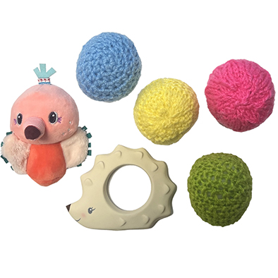 Hermoso set de exploracióńn y manipulacióńn, consta de un sonajero (Anaïs está concebido para enseñar a los niños acciones y reacciones, desarrollar sus habilidades motrices y estimular su oído), un mordedor de caucho natural orgánico y 4 pelotas de estimulacióńn de lana colores surtidos.