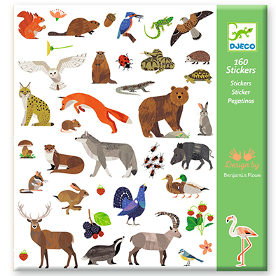 Divertida caja de stickers de hermosos animales. El paquete incluye 160 pegatinas de diferentes colores y formas. Desde animales tan conocidos como ciervos, zorros y jabalíes hasta los menos conocidos urogallo, tejón y jilguero, los niños y niñas descubrirán la rica diversidad de la flora y fauna. Pega las pegatinas como quieras para crear tus propias escenas y decorar a tu gusto. Contiene: 2 hojas diferentes con 2 copias cada una para que puedas reutilizar tus pegatinas favoritas Fabricado en papel y cartón con certificación FSC®.